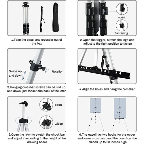 MATERIAL AND STABILITY PERFORMANCE painting easel for adults adopted sturdy and durable aluminum artist easel Stand- lighter and more durable than other material easels; The spring clip on top of the tabletop easel makes the canvas less likely to fall,Makes the painters easel for adults more stable. Art Easel Stand Height ADJUSTABLE easels for paining canvas can adjustable from 17 inches to 66 inches in height perfect for floor easel or tabletop easel displays, art easel folds to just 21″ for easy storage and transport, painting easel easy to turn knobs for quick height and angle adjustments.